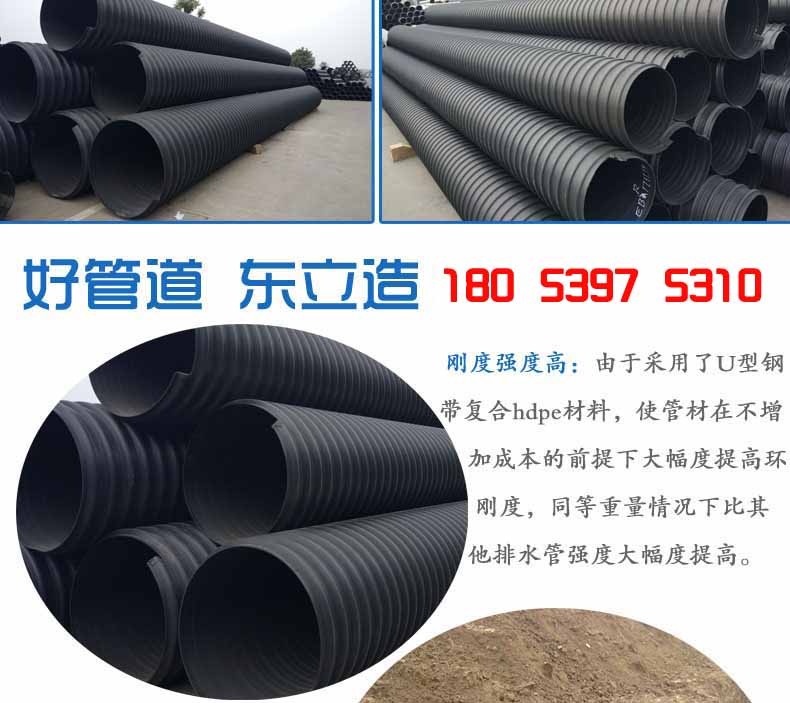 2.大口徑高強度:由于采用了U型鋼帶復(fù)合PE材料,使管材在不增加成本的前提下大幅度提高環(huán)剛度,同等重量情況下比其他塑料排水管強度大幅度提高。可解決重載等一系列問題,大口徑管材優(yōu)勢更加明顯,比水泥管和其它塑料管重量更輕、強度更高。