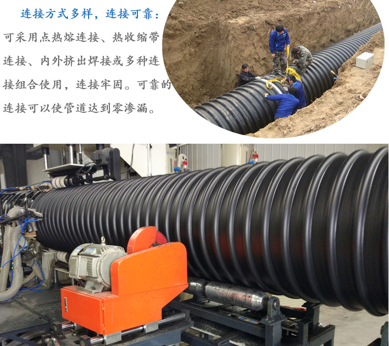 1.連接方式多樣,連接可靠 :可采用電熱熔連接、熱收縮帶連接、內(nèi)外擠出焊接或多種連接組合使用,連接牢固。可靠的連接可以使管道達到零滲漏。